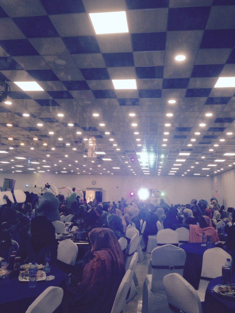 So tanze ich nun inmitten einer Horde fremder Frauen, die glitzernde bunte lange Kleider und Tücher um ihre Körper gewickelt haben und mich tanzend und schnipsend anstrahlen. Die Musik gefällt mir – eher orientalisch als afrikanisch. Nach kurzer Zeit habe ich mich dem Rhythmus angepasst und wir tanzen eine Stunde lang. Etwa 50 Menschen tanzen, die Frauen links, die Männer rechts, Kinder überall, das Brautpaar mittendrin. Rundherum sitzen mindestens 100 weitere Personen, es ist ein Kommen und Gehen. Alles wird dokumentiert durch 3 Kameramänner und auf zwei Bildschirmen life übertragen. Es fällt auf, dass die ungewöhnlichen Gäste (sprich Ausländer) recht oft auf den Bildschirmen auftauchen. Das Brautpaar wird sich freuen 😀
