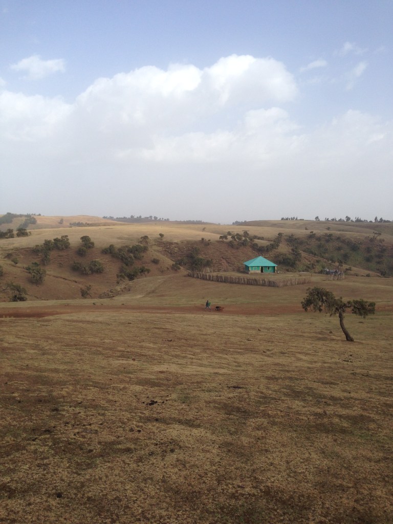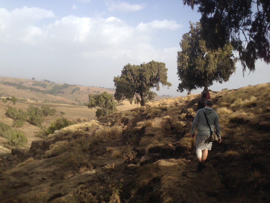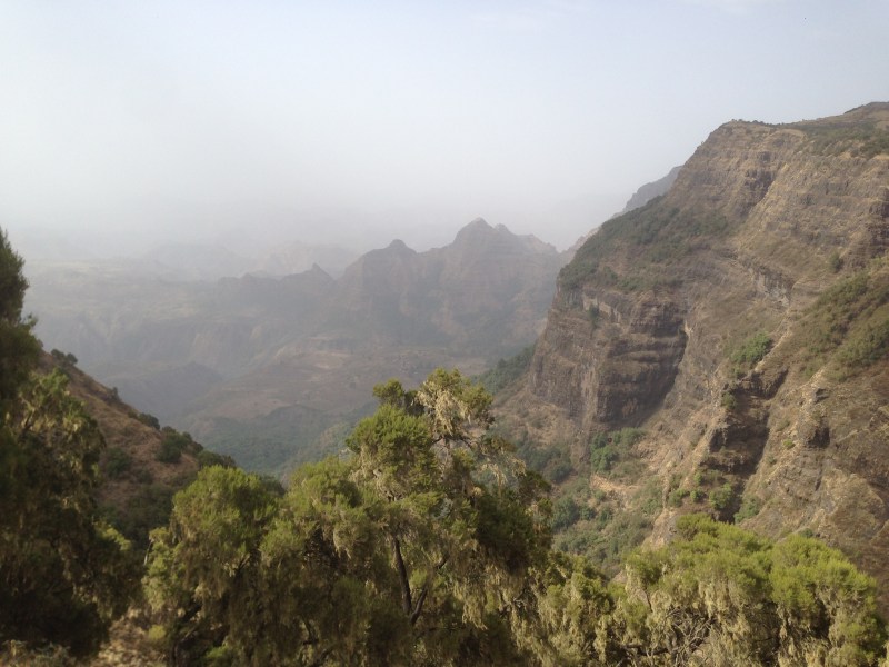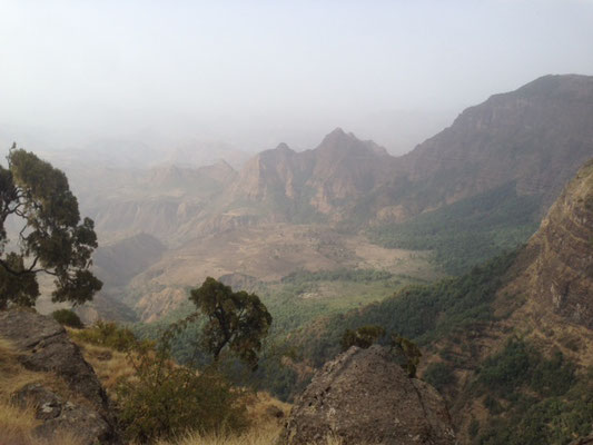 Also weiter, nächste Station: Gondar. Gondar stellt sich nicht als unsere Glücksstadt heraus. Ich habe Magenprobleme und Marw schrammt sich das Bein auf. Esther kümmert sich um uns zwei Kranken und die beiden erkunden Gondar ohne mich. Der nächste Bus bringt uns nach Denbark, eine Stadt am Fuße des Simien Gebirges. Denbark hat nicht nur keinen Charme, sondern eher negativen Charme. Das gute und schlechte ist, dass Nebensaison ist. Gut ist, dass wir nicht viele andere Touristen sehen. Schlecht ist, dass sich deshalb alle 200 Tour-Guides in dieser kleinen Stadt auf uns stürzen und uns das Geld aus der Tasche ziehen wollen. Für mich, die zuvor einigen Monate im Sudan lebte, mit null Tourismus und einer Kultur, die sehr respektvoll und gastfreundlich ist, ist die Aufdringlichkeit und Dreistigkeit etwas zu viel und wir trauen irgendwann niemandem mehr über den Weg. Wir sind froh und atmen durch, als wir im Simien Gebirge ankommen. Unser zu Hause für eine Nacht – eine kleine Hütte auf knapp 3000 Meter Höhe ohne fließend Wasser und Strom. Fantastisch! Die Essenszubereitung dauert 2-3 Stunden, ich hake Holz für ein Lagerfeuer und der Sternenhimmel ist kaum zu übertreffen. Insgesamt machen wir zwei kürzere Wandertouren, begegnen vielen (erstaunlicherweise friedlichen) Affen und genießen die fantastische Aussicht. Da das Simien Gebirge ein Nationalpark ist, bekommen wir einen Aufpasser an die Seite. Gegen den Aufpasser konnten wir nichts unternehmen, der wurde auf der Stelle an unsere Seite rekrutiert, als wir den Eintritt für den Nationalpark zahlten. Etwas dreist, fanden wir, entschieden uns aber, es hinzunehmen und unseren Aufpasser zu unserem 4. Team-Mitglied zu machen und ihn ständig vollzulabern. Er hielt zwar die meiste Zeit eher etwas mehr Abstand zu uns, aber manchmal konnte ich schon ein kleines Lächeln bei ihm erhaschen. Was mich abschreckte, sehr stark mit ihm in Kontakt zu kommen, war die Kalaschnikov, die er Tag und Nacht bei sich trug. Ich erklärte mir, dass es zum Schutz vor den Affen sei, wobei ich vermutlich verrückt geworden wäre, hätte er wirklich auf die Affen geschossen. Nichts ist passiert, kein Affe tot, wir waren ein nettes 4er Team und er vermutlich der einzige Aufpasser im Park, der bei solchen ‘blöden Idioten’ mitmusste, die nicht mal in einer der schönen Lodges schliefen, sondern ohne Wasser und Strom in einer kalten Hütte. Ja, kalt! Ultra kalt. So kalt, dass Esther und ich alle unsere Sachen übereinander gezogen und froh waren, dass es dicke Decken gibt. Diese Decken waren solche, wie ich sie von meiner Oma kenne. Ich meine, sie haben sie immer vom Polenmarkt mitgebracht: riesig, flauschig, mit einem Riesen Panda drauf. Wer kennt die nicht 😀 Die waren meine wärmende Hoffnung in diesen äthiopischen kalten Nächten. Schließlich waren es, wie Marwin dann nachts nachschaute, 18 Grad! Haha. Marwin lachte uns aus, wir lachten mit, empfanden es aber immer noch als kalt und ich war froh über die Polenmarkt-Decke in Äthiopien. Am nächsten Tag wurde nochmal herumgewandert, vergeblich nach Steinböcken Ausschau gehalten und per Anhalter mit einer Rickshaw ging es zurück in den nächsten Ort.