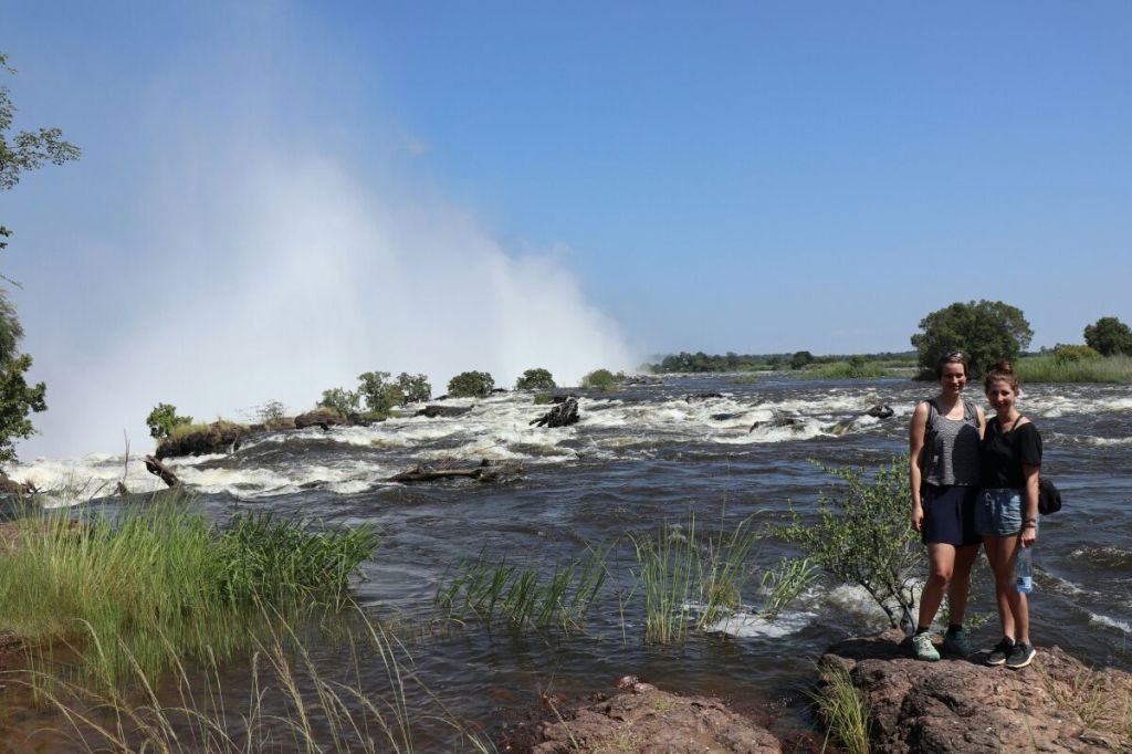 Unser zweiter Roadtrip führte uns nach Livingstone zu den Viktoria Wasserfällen. Mit mehr als 800 Meter Länge gelten diese Wasserfälle als die Größten weltweit und dank der Regenzeit preschte das Wasser nur so hinunter in die Schlucht aus ich habe keine Ahnung wie vielen 100 Metern, vermutlich sogar über 1000. Rund herum zauberten Regenbögen, Nebel, riesige Schluchten und ein Regenwald wie aus dem Bilderbuch eine wunderschöne Kulisse. Entgegen unserer Hoffnung konnte man nicht wirklich viel in der Gegend wandern, sondern es gab extra für Touristen geteerte und beschilderte Wege. Dennoch hatten wir so die Möglichkeit, die Wasserfälle von allen Seiten und Perspektiven zu betrachten. Obwohl wir Nichts (!) sehen konnten, weil der Regen zu stark war, fand ich den Weg gegenüber der Wasserfälle am beeindruckendsten. Wahrscheinlich auch gerade, Weil wir nichts sehen konnten. Der Regen kam nämlich nicht vom Himmel, sondern von der aufsteigenden Gicht (heißt das bei einem Wasserfall so?) die durch die Kraft des Wasserfalles erzeugt wurde. Von dieser Seite konnte man auch den zweiten Teil des Wasserfalls sehen, der sich in Simbabwe befindet. Dort befindet sich nämlich die Grenze und diese beiden Länder teilen sich das Naturwunder und nehmen somit beide damit Geld durch Touristen ein und werden auch beide durch Wasserenergie versorgt. Diese Power muss man natürlich nutzen. Leider muss ich später lesen, dass die Viktoriafälle (zum Namen kommen ich gleich) immer längere Trockenphasen haben. Früher noch nur einige Wochen, ist heute der größte Wasserfall der Welt für mehrere Monate fast trocken. Klimawandel sei die Ursache. Hier habe ich mal einen Link herausgesucht, der darüber berichtet und ein beeindruckendes und lehrreiches Video dazu zeigt. https://www.t-online.de/nachrichten/panorama/id_86978898/victoria-falls-wie-schlimm-steht-es-um-die-victoriafaelle-.html