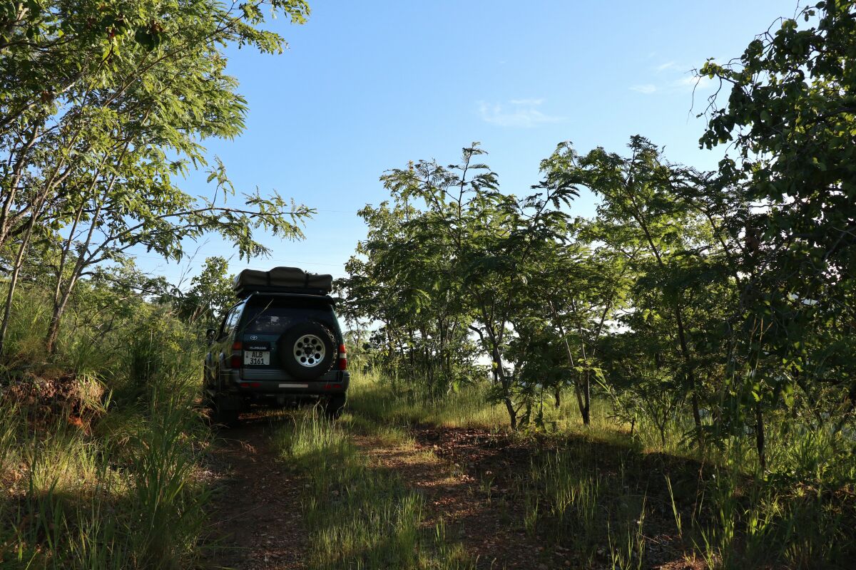 Es geht teilweise in Schritttempo weiter. Einer läuft vor, meistens Jocelyne, schaut sich die Straße an und lotst mich weiter. Die Schwierigkeit ist nicht mehr die Steigerung, sondern die tiefe Fuhre zwischen den Rädern. Die sogenannte “Spur”, die wir entlang fahren, ist tatsächlich genau eine Spur. Der Bereich zwischen den Rädern, der normalerweise bei einer Straße oder einem Weg vorhanden ist, ist unterspült. Wir machen so weiter bis es schon länger dunkel ist und wir erneut vor einem trockenen Flussbett stehen. In der Dunkelheit zu gefährlich, wir befinden uns laut Google Maps (dem glauben wir eh nichts mehr) kurz vor der Lichtung aus dem Gestrüpp, aber wir wollen es nicht riskieren. Wir bleiben mitten auf dem Weg, der mittlerweile wieder eine ebene, undurchtrennte Spur ist, stehen. Gottseidank haben wir ein Dachzelt, eine Flasche Rotwein, Brot, gekochte Eier und Gurken. Mensch – sind wir gut für einen 12-stündigen Wildnis-Trip ausgestattet. Nicht. Der Rotwein ist allerdings Gold wert. Wir lesen laut aus unseren E-books vor, um uns etwas auf andere Gedanken zu bringen und schlafen irgendwann ein. Bis 5 Uhr morgens. Bei Tagesanbruch starten wir die letzte Etappe. Es dauert noch circa 1 Stunde bis zur Lichtung, die letzten Flussbetten fühlen sich wie das Ein-Mal-Eins des Autofahrens an und wir fangen an zu kreischen, als wir auf dem flachen Land in der Ferne eine Person sehen. Er schaut uns verwirrt an, grüßt uns und schaut uns weiterhin verwirrt an, als wir ihm erklären, dass wir seit 20 Stunden oder so niemanden mehr getroffen haben. Die letzten Kilometer hebt sich die Stimmung und wir kommen irgendwann in der Lodge an.