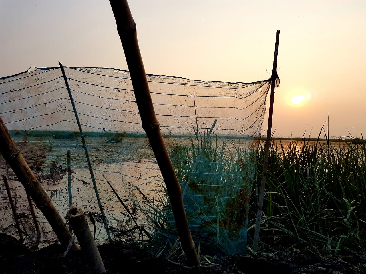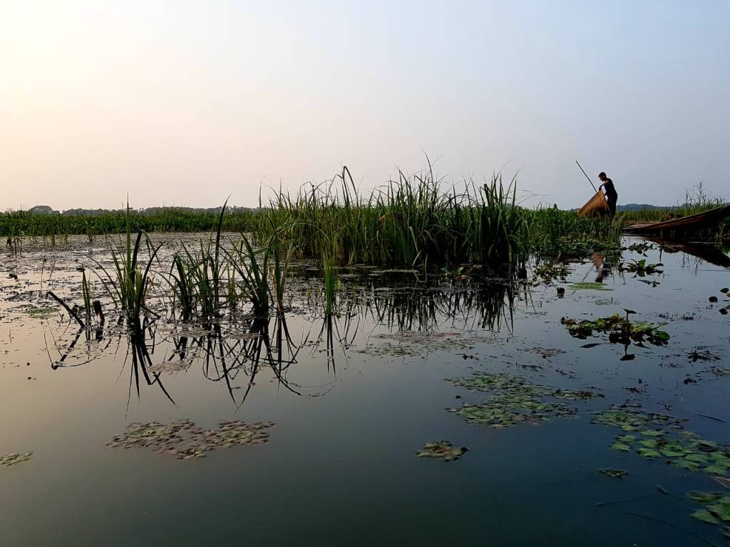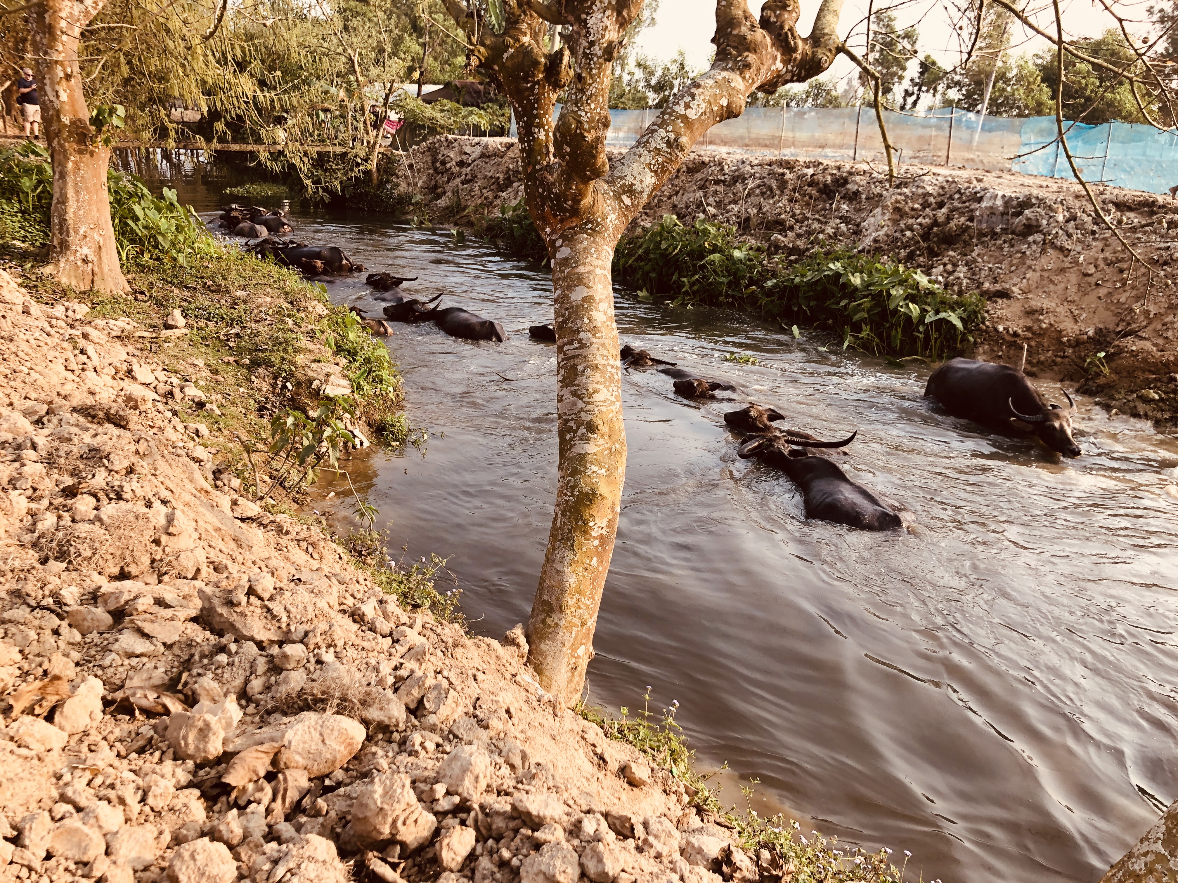 Und was hat Sreemangal noch zu bieten, außer nette Menschen? Natur und Kultur zum Beispiel. Irgendwie schwierig zu unterscheiden in Bezug auf den Teeanbau, ob es eher zu Natur oder eher zu Kultur gehört. Tee wuchs nicht natürlich in Bangladesch, aber durch die Kolonialisierung durch Großbritannien kam der Tee nach Bangladesch und wurde mit der Zeit zu einem täglichen Lebenselixier. Da Bangladesch sehr viele Menschen beherbergt, die dieses Elixier gerne jeden Tag mehrmals zu sich nehmen, und weil Bangladesch auch die klimatischen Bedingungen dafür hat, entwickelten sich riesige Teeplantagen. Überall, wo man hinschaut, in der Region rund um Sreemangal sind Teeplantagen, dunkelgrüne kleine Büsche, die eng aneinander stehen und sich über eine leicht hügelige Landschaft ausbreiten. Ich muss ehrlich sein, ich hätte weder erkannt, dass es sich hier um Teeplantagen handelt, noch um welchen Tee. Und ich muss auch ehrlich gestehen, dass ich nicht mal wusste, dass schwarzer und grüner Tee von ein und der selben Pflanze kommt. Wusstet ihr das? Stimmt aber. Die Blätter, die getrocknet werden, werden zu grünem Tee verarbeitet, die Blätter, die fermentiert werden, werden zu schwarzem Tee verarbeitet. Interessant ist auch, dass wie oben beschrieben, der Tee es gar nicht nach außerhalb von Bangladesch schafft. An den 160 Millionen EinwohnerInnen kann sich kein Teekrümelchen heimlich vorbeischleichen und über die Grenze huschen. Deshalb haben wir natürlich zugegriffen und als Mitbringsel ein paar Tees eingekauft. Neben Tee wachsen in dem tropischen Klima auch Zitronen, Auberginen, Ananas und viele andere Leckereien. Und Reis. Weil Wasser. Wer also an die mega krass coolen Reisplantagen auf Bali denkt und seine Instagram-Augen schon aufleuchten sieht, in Bangladesch wird auch Reis angebaut. In Vietnam auch. In Thailand auch. In Ghana auch. Langweilig irgendwann denkt man, aber nein. Ich weiß nicht warum, aber Felder, die in Wasser getränkt sind, auf denen hier und da ein Büffel steht und sich die Sonne spiegelt, haben komischerweise eine magische Anziehungskraft auf mich. Auf euch auch? Diese Büffel haben wir auch gesehen. Aber nicht nur einen, sondern eine ganze Horde. Gerade auf dem Heimweg vom Feld, liefen oder schwammen die grazilen Dickhäuter in einem kleinen Fluss gen Heimat. Als hätte sie jemand dort platziert, um die schönste Naturdoku von Bangladesch zu filmen, schwammen sie an uns vorbei. Videos kann ich mal bei Facebook teilen, sieht magisch aus. Reis und Büffel – magisch für Theresia. Wie einfach.