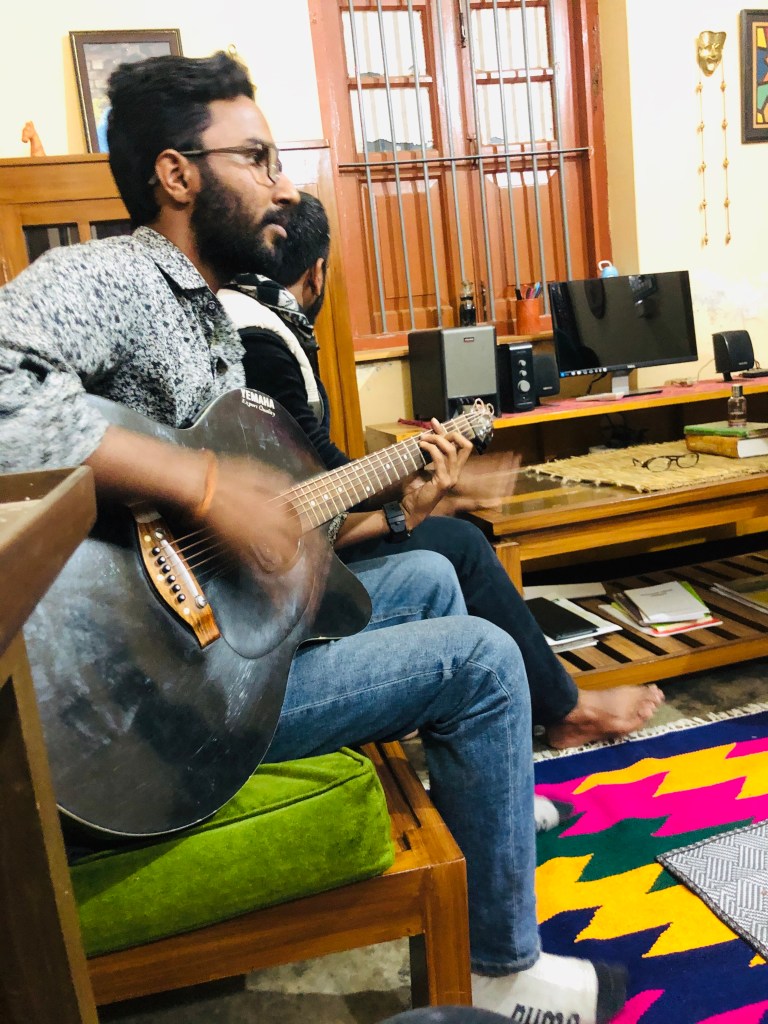 Aber nun mehr zu der alles verändernden Bekanntschaft. Tapas ist in meinen Augen der wahre Bürgermeister der Stadt Sreemangal. Es ist nicht so als hätte ich den richtigen Bürgermeister je getroffen. Aber so wie Tapas stelle ich mir eine Person vor, die so einer Aufgabe würdig ist. Der oder die Bürgermeisterin als Meisterin der Bürgerinnen und Bürger. Tapas ist Geschäftsmann, aber Geschäftsmann mit einem sehr ausgeprägten Gemeinwohlsinn. Er war kaum älter als ich, hatte aber schon ein Gästehaus, ein Reisebüro, einen Teeverkauf und andere laufenden Geschäfte erfolgreich aufgebaut. Wir begegneten ihm mehrmals in den Straßen oder in der Nähe des Bahnhofes in Sreemangal und sahen ihn irgendwelche Gemeinwohl orientierten Projekte organisieren. Er war so der Typ Mensch, der sagt: „Ich denke der Müll auf den Straßen ist nicht gut, da sammeln sich Bakterien an und jemand, der das berührt, kann schneller krank werden. Ich schaue mal, wie man Mülleimer aus alten Kanistern herstellt, trommele eine Truppe zusammen, mache Plakate und in einem Jahr schmeißt keiner mehr Müll auf den Boden.“ Sehr inspirierend der Typ. Das war eben ein ausgedachtes Beispiel, aber so oder so ähnlich stelle ich mir seine Gedanken vor. So waren wir also glücklich, in seinem Gästehaus untergekommen zu sein. Mit Freude buchten wir auch bei ihm einen Tagesausflug, mit Freude kauften wir seinen Tee und mit Freude saßen wir abends mit ihm und seinen Freunden zusammen bei Speis und Trank und Musik. Musik verbindet. So auch an diesem einen Abend. Tapas lud uns ein, mit zu einem musikalischen Abend zu seinen Freunden zu kommen. Wir waren zu 10., saßen auf Sesseln, Hockern und auf dem Boden, zwei spielten Gitarre, andere sangen. Wir staunten, grinsten und klatschten. Es waren junge Menschen aus Bangladesch, die Offenheit, Toleranz, Ruhe und Herzlichkeit ausstrahlten. Frauen und Männer, Muslime und Hinduisten, Städter und Landeier, einige mit traditionellen anderen mit moderner Kleidung saßen um uns herum, sangen aus voller Lunge, tranken heimlich in der Küche Alkohol und nahmen uns mitten in ihren Kreis auf. Es war unser letzter Abend und gegen Mitternacht sollte unser Zug gehen. So brachten uns alle (!) noch zum Bahnhof und verabschiedeten uns wie alte Freunde. Mann, fühlten wir uns willkommen.