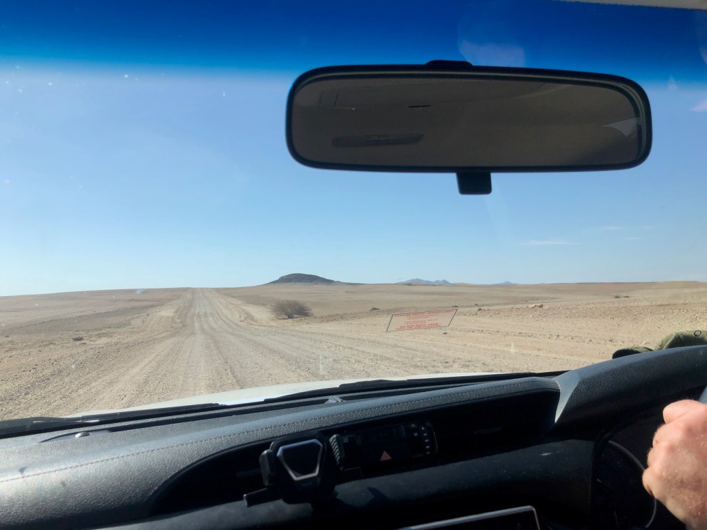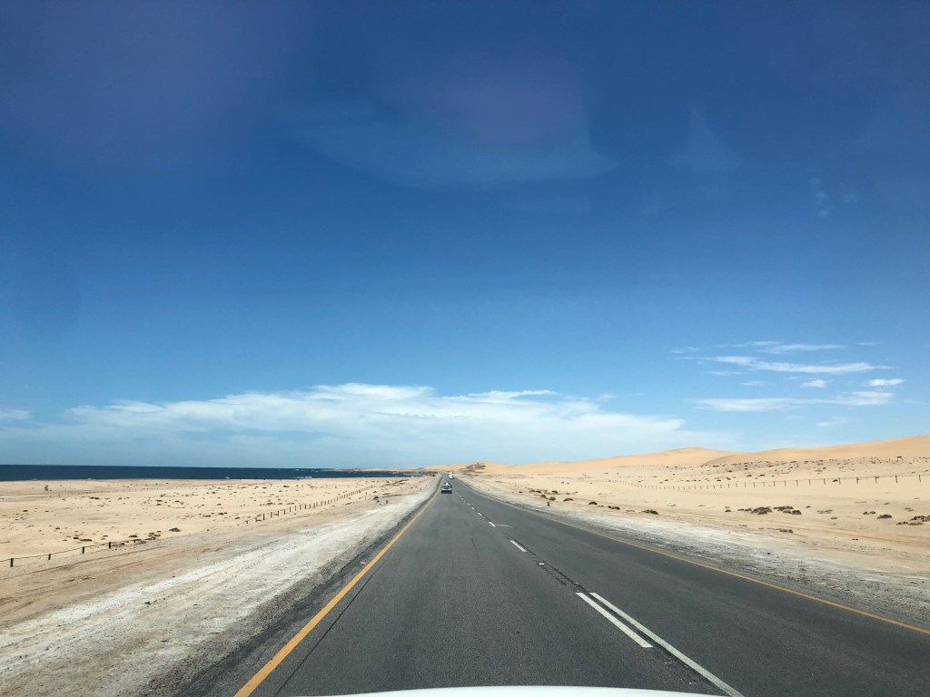 Namibia grenzt zu großen Teilen des Landes an den Atlantik. Wenn man so schaut, könnten es fast 1/3 der Grenzen des Landes sein, aber genauer muss es hier im Text auch nicht sein. Für uns ist noch nicht daran zu denken, dass irgendwo Wasser auftauchen könnte, geschweige denn Meer. Wir fahren, wie so oft, auf einer langen, schnurgeraden, geteerten Straße entlang, links und rechts Wüste, keine Menschenseele, flache Landschaft so weit das Auge reicht. Ein klein bisschen hügelig wird es von Zeit und Zeit. Die Hügel zusammen mit der durch Hitze entstehende Fata Morgana auf der Teerstraße, lässt es aussehen, als tue sich vor uns eine Achterbahn auf. Ich frage zur Sicherheit Marwin, ob er das auch sieht, da kurz die Befürchtung habe, mit meinen Augen stimme etwas nicht. Als er bejaht, versuchen wir die zwei Schlafenden hinten nicht zu wecken, wenn wir kurz vor einem Hügel, wie vor einer herannahenden Achterbahnabfahrt, einen kleinen Trommelwirbel und Aufregungsschrei machen.