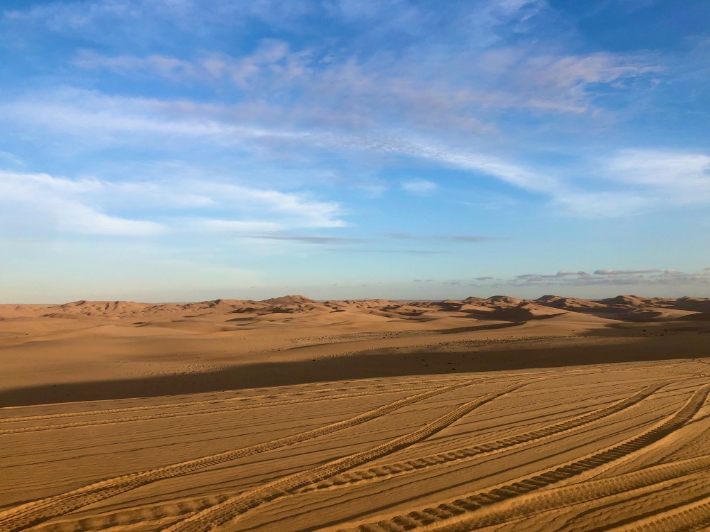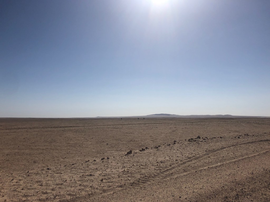 Erneut geht mir im Kopf herum, dass ich mir bis auf das eingebildete Wasser, welches durch die Fata Morganas entsteht, kaum vorstellen kann, dass bald vor uns ein endloses Meer auftauchen sollte. Soll es auch nicht. Nicht einfach so, sagt Mutter Natur. Die steinige, hellgraue Wüste veränderte sich zu einer „richtigen“ sandigen, dünigen Wüste. Von der besten Seite zeigt sie sich, denke ich mir und zwinkere ihr zu, der Mutter Natur. Ein Meer von Dünen, soweit das Auge reicht.